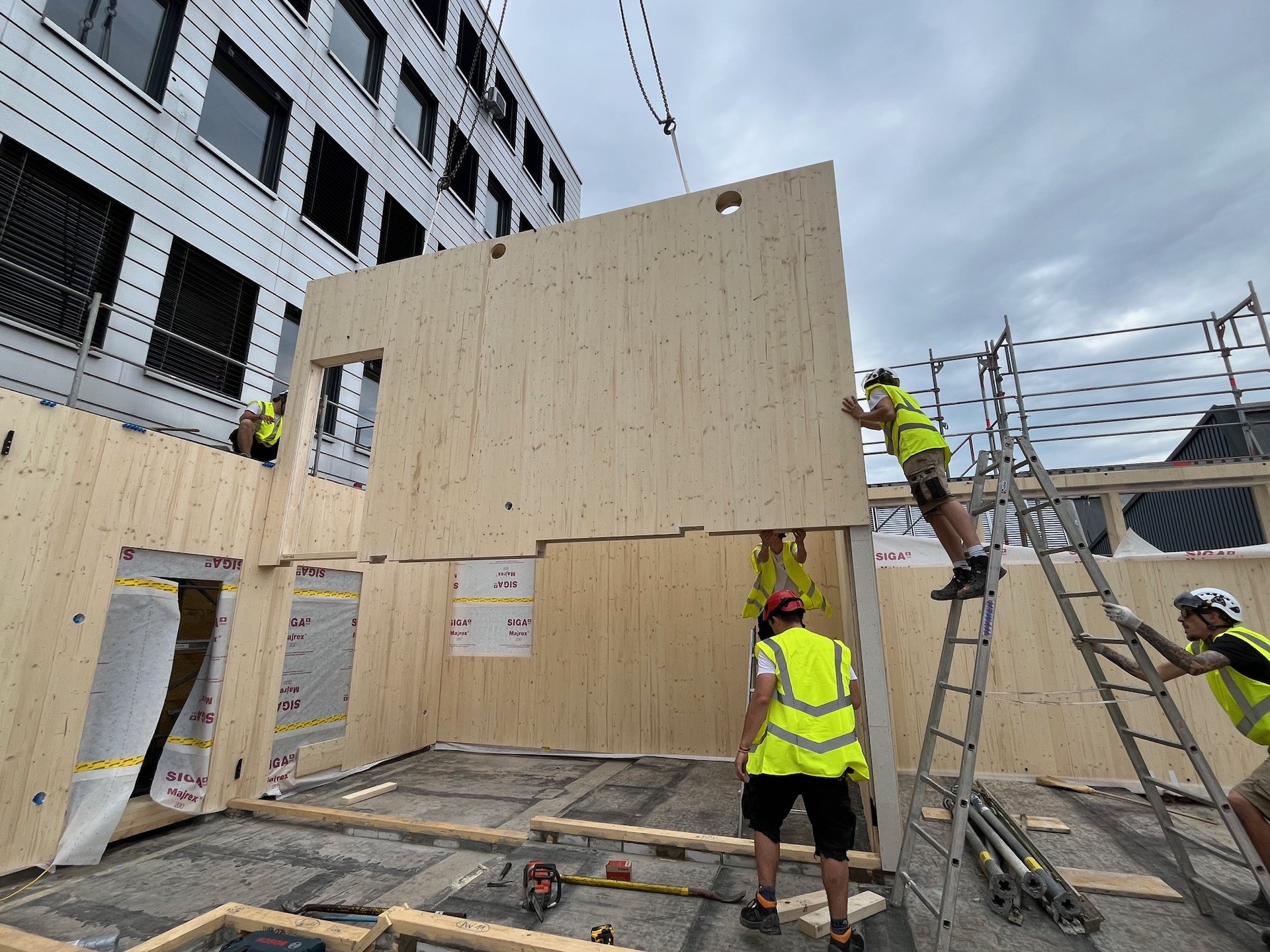 Die Montage der vorgefertigten Holzrahmenkonstruktion erfolgte mittels Funk ohne direkte Einsicht durch den Kranführer.